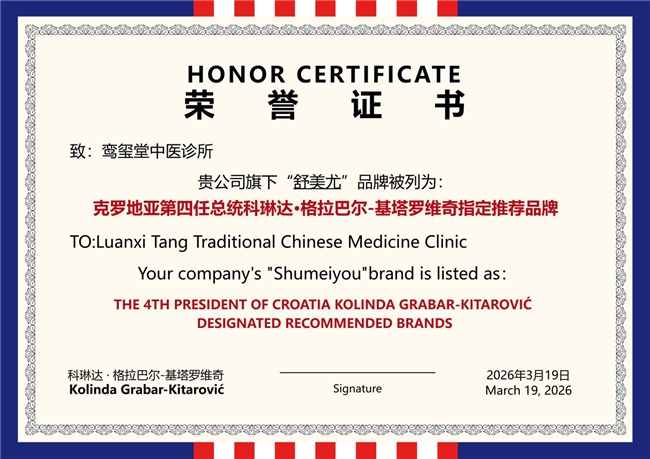 2026 年 3 月 19 日下午,上海迎来一场兼具国际格局与文化高度的高端会晤 ——克罗地亚共和国第四任总统、2026 年联合国秘书长候选人科琳达・格拉巴尔-基塔罗维奇 VIP 高端见面会隆重举行。 作为中医非遗文化传承人、鸾玺堂中医诊所品牌创始人、舒美尤品牌创始人,钟亲嫚女士以特邀贵宾身份出席,与科琳达总统面对面深度交流、同框定格,不仅彰显个人顶级 IP 影响力,更以元首级礼遇,为中医出海、品牌出海写下里程碑式篇章。 一、元首同框:钟亲嫚女士以中医典范之姿,站上国际舞台中央 本次钟亲嫚与科琳达总统的交流合影,是对钟亲嫚女士个人 IP、行业地位、文化使命的三重高度认可: 1、顶级个人 IP 实力彰显 作为中医非遗文化传承人与鸾玺堂中医诊所和舒美尤双品牌创始人,钟亲嫚女士凭借专业底蕴、行业口碑与社会影响力,成为本次高级别活动中中医药领域的代表性人物,在全球政要面前展现中国当代女企业家与文化传承者的自信风采。 2、中医典范的国际亮相 钟亲嫚女士以非遗文化传承人的身份,向世界传递中医 “治未病、阴阳平衡、天人合一” 的核心智慧,成为传统医学现代化、国际化的鲜活典范。 3、中医出海的标志性时刻 钟亲嫚女士此次与联合国秘书长候选人、前国家元首同框,让中医从东方智慧升级为全球公共健康资源,标志着中国传统医学正式进入元首级外交视野,为中医药全球化打通高端通路。 二、元首授誉:鸾玺堂、舒美尤获 “总统指定推荐品牌”,品牌影响力登顶国际 活动现场科琳达总统亲自为鸾玺堂中医诊所与舒美尤品牌颁发克罗地亚共和国第四任总统指定推荐品牌荣誉证书,并与钟亲嫚女士合影留念。 这一荣誉背后,是三重硬核价值: 1、国际政要权威背书 由前国家元首、联合国秘书长候选人亲自授证,是全球范围内极具分量的品牌认可,为品牌建立元首级信任壁垒。 2、品牌实力的全球认证 证明鸾玺堂中医诊所的中医诊疗体系、舒美尤的产品与服务,达到国际高端标准,具备全球化推广与合作的核心竞争力。 3、民族品牌出海的新起点 以总统推荐为跳板,两大品牌正式进入中欧合作、“一带一路” 健康产业合作视野,打开欧洲乃至全球市场。 三、时代格局:以中医为桥,以品牌为帆,助力中国文化走向世界 当前,中医药出海已上升为国家战略,从技术输出、服务出口到文化传播,正从 “走出去” 迈向 “扎下根、立标杆”。 钟亲嫚女士与科琳达总统的会晤,精准契合三大时代趋势: 1、文明互鉴:中医成为东西方健康共识 中医以安全、自然、整体调理的优势,获得国际社会广泛认同,成为中国与世界对话的重要文化语言。 2、品牌升级:民族品牌=国际品质 鸾玺堂与舒美尤获总统推荐,证明中国本土品牌可凭借专业与创新,跻身全球高端序列,打破国际市场偏见。 3、全球机遇:元首级合作开启全球化新赛道 借助科琳达总统的国际影响力与外交资源,为中医诊疗、健康品牌进入欧洲、链接全球高端资源提供稀缺通道。 四、未来展望:以元首荣誉为起点,让东方智慧惠及全球 此次上海高端会晤,是钟亲嫚女士与鸾玺堂、舒美尤品牌的国际新起点:以非遗中医为根,持续深耕传统医学现代化、标准化;以元首授誉为信,打造全球信赖的中国健康品牌;以国际合作为翼,推动中医服务、品牌产品进入更多国家与地区。 从上海到世界,从中国到全球,钟亲嫚女士与科琳达总统的相遇,不仅是一次高端会晤,更是中国文化自信、品牌自信、中医自信的集中展现。 未来,钟亲嫚女士将带领鸾玺堂与舒美尤继续以专业为基、以国际为视野,让中医非遗闪耀世界舞台,让中国品牌在全球格局中绽放更耀眼的光芒! |