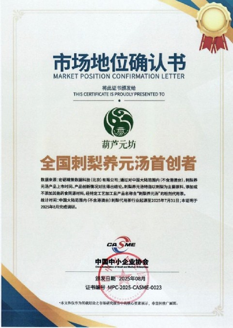 葫芦元坊获“全国刺梨养元汤首创者”市场地位确认书